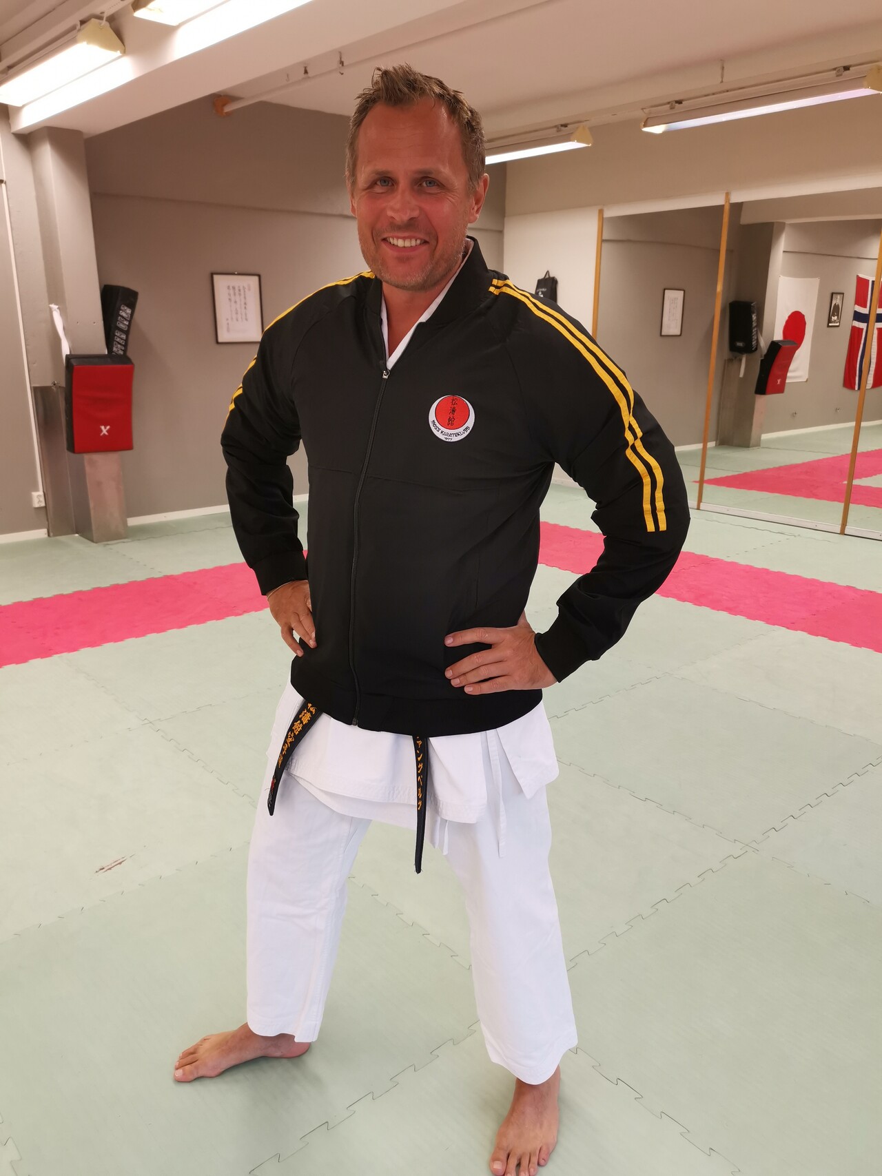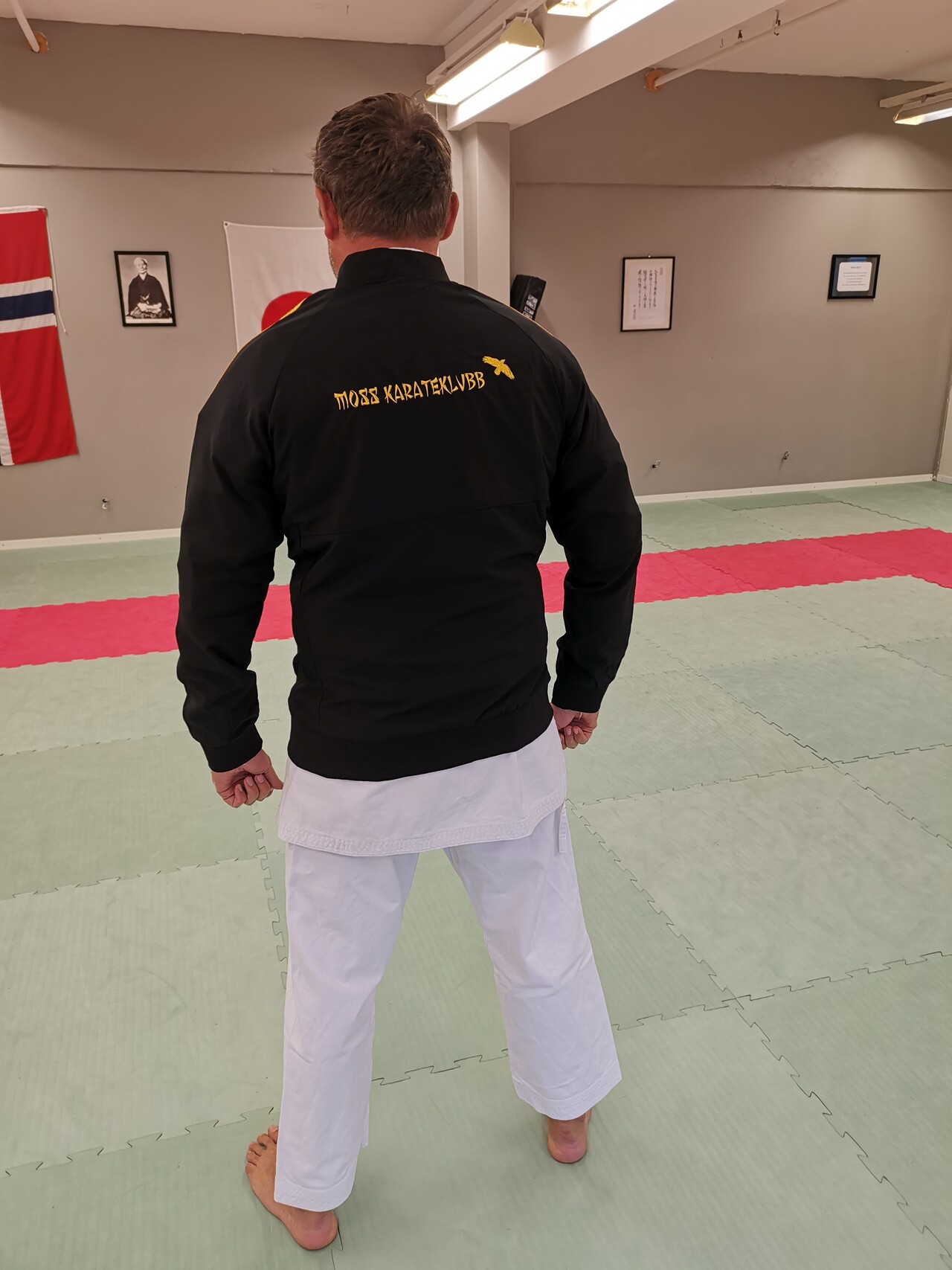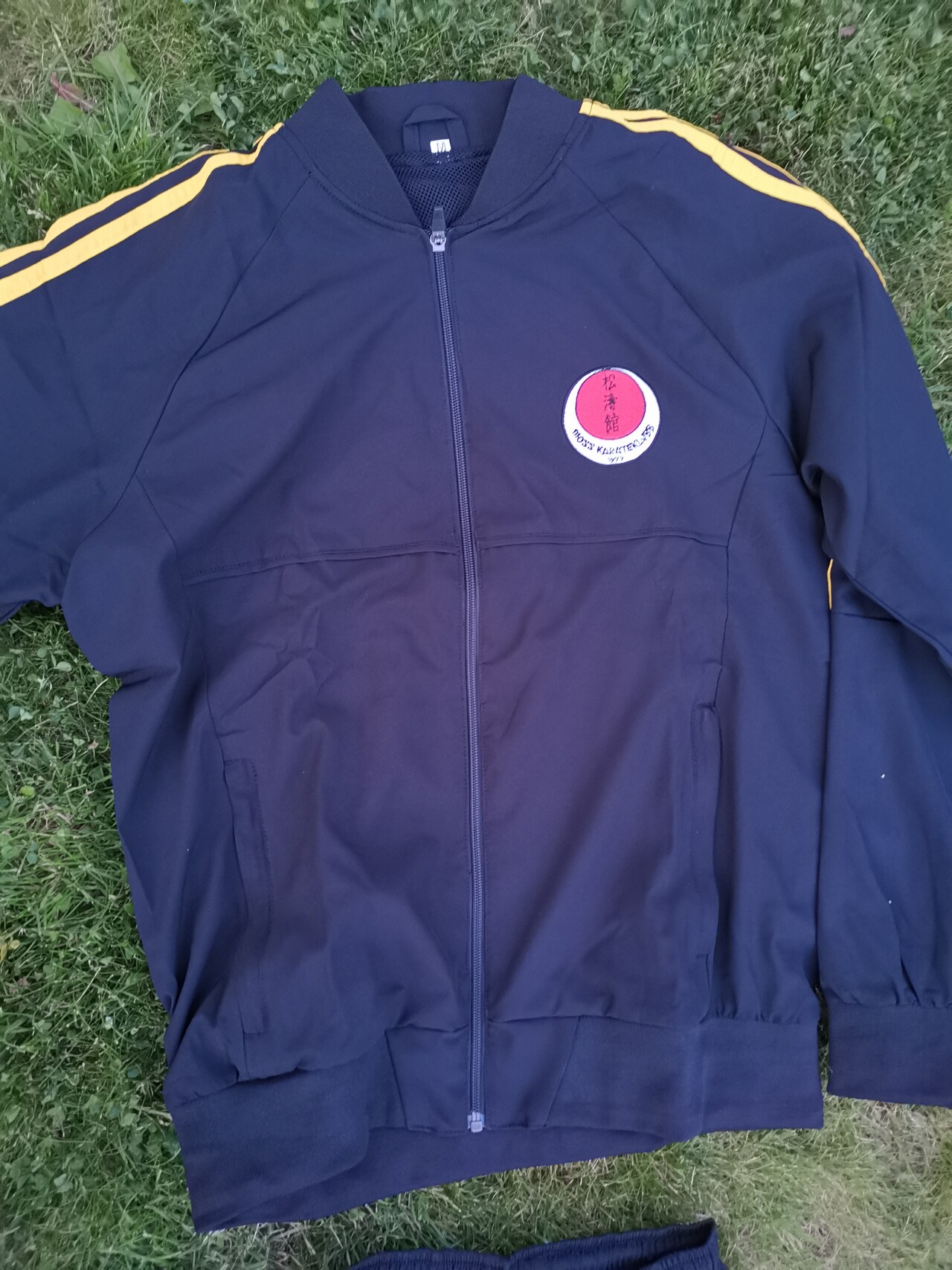Overtrekksdrakten er i sort og gult med broderte klubbdetaljer. Anbefaler å kjøpe romslig størrelse, siden karatedrakt (Gi) skal kunne få plass under.
